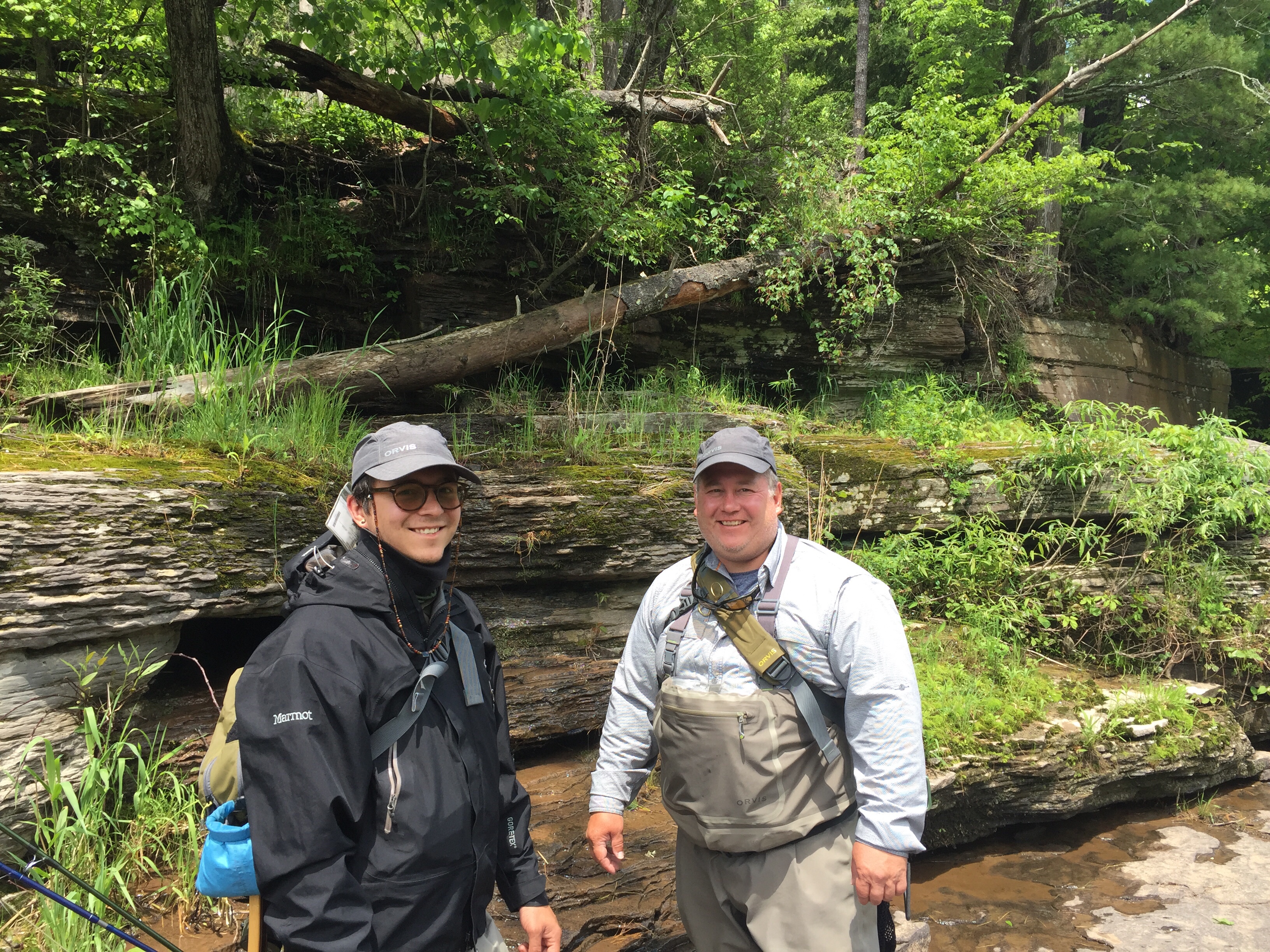 The pool we fished already had a few fly anglers lined up at the top swinging wet flies and drifting nymphs. Not wanting to join the line up, my son and I forded the swift moving water above the pool to fish from the opposite bank. The flows were high. There was no one over on the other side for good reason. It was one of the toughest wades that I’ve done in recent years with no wading staff. In the photo we are joking about the crossing and a couple close calls that almost ended with a swim! The ledges and rock formation on Pine make for some some wonderful scenery but also some really dynamic fish holding spots.