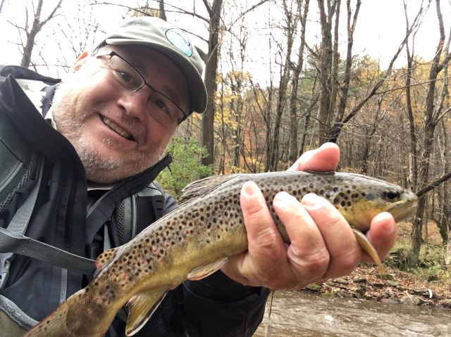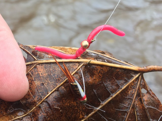 The leaf clutter was frustrating so I changed up to a simple single fly tight line rig. I chose my go-to muddy water sub surface fly, a Squirmy Worm, tied on a size 14 hook with a bead. I tie my worms with longer material than most folks to get a bigger profile for muddy water conditions. A couple pieces of big tin shot and I was in business! Less snags and more brown trout! Just the way I like it!