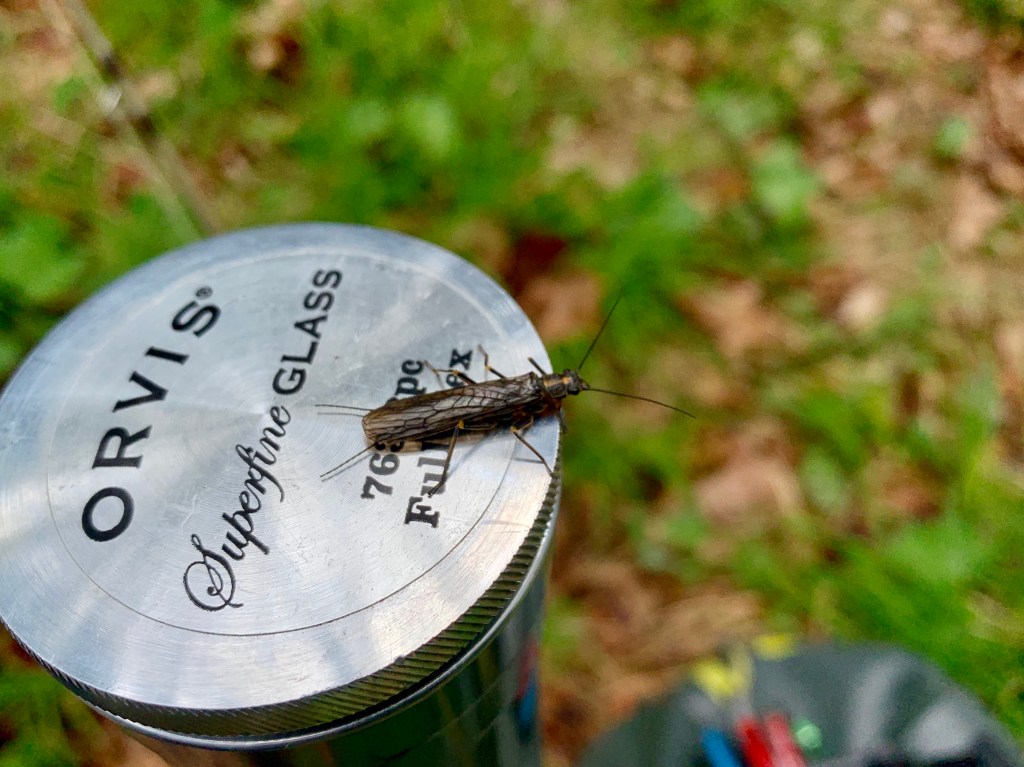 I fished the first few pools and runs with nymphs with no luck. Not even a fish sighting. I paused for a moment to regroup wondering if this flow even had trout. Glancing at my rod tube, I noticed a brown stone fly perched on top of it. This snapped me out of my tunnel vision. I sat motionless for several minutes watching the air and water for signs of a bug hatch. I saw a Golden Stone, several small flying clusters of Sulfers and what looked like some small Caddis. I tied on a size #12 Caddis and went to work on the next small pool. The bath tub sized pool was bordered by a small root ball on one side. An idea spot for trout to feed and seek refuge.